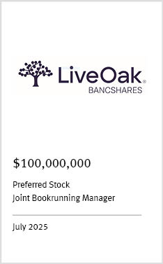 Our team also specializes in capital solutions for the banking industry. Core services in our capital markets effort include public and private placements of equity, debt, mutual to stock conversions and hybrid securities.